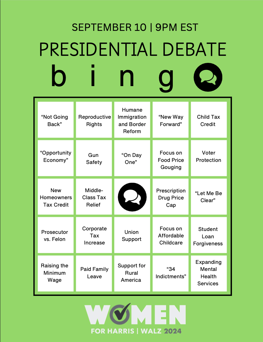 Ready for Debate Night? Host a watch party and get your bingo card ready! Click the Bingo Card (or here) to get a downloadable version.